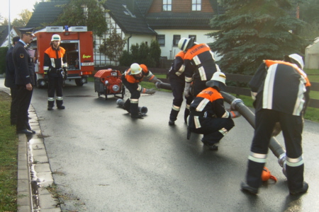 | Am 21. Oktober 2006 legten 14 Feuerwehrkameraden der FFW Geschwand in 5 Leistungsstufen mit Erfolg die Prüfung fürs Leistungsabzeichen ab. Unter den Augen der Schiedsrichter Reiner Disselberger (KBI) aus Neunkirchen, Wolfgang Baumann aus Walkersbrunn und unserem KBM Simon Hofmann aus Bieberbach legten die Kameraden eine hervorragende Prüfung ab. Eine so ordentliche, saubere, ruhige und materialschonende Leistung habe ich in diesem Jahr noch nicht gesehen, lobte KBI Reiner Disselberger die Prüflinge. Im Anschluss an die Abnahme wurde dann die erfolgreich abgelegte Prüfung mit den restlichen Aktiven Kameraden und den Ehrenmitgliedern gebührend gefeiert. |