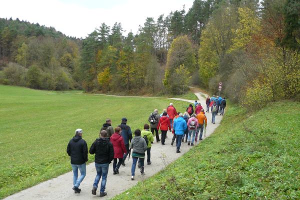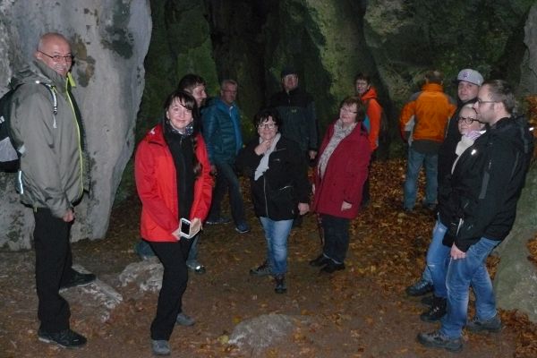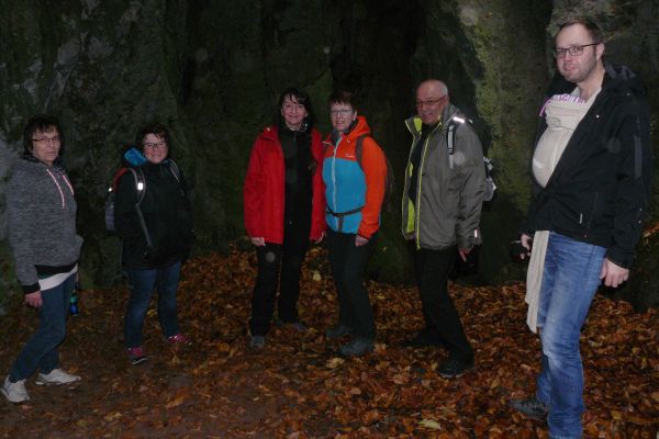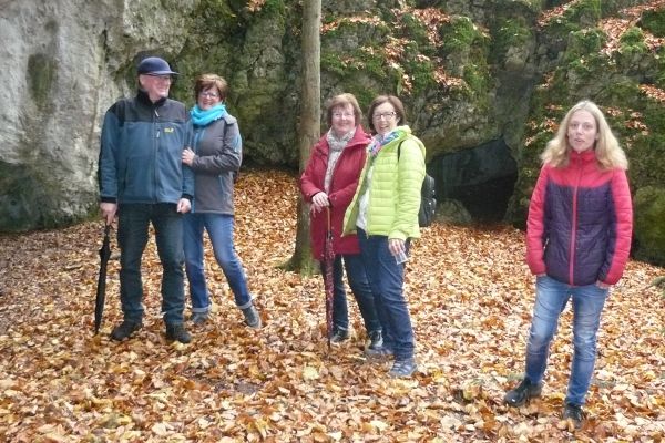 | Nach der wetterbedingten Absage der FSV-Herbstwanderung vom 03. Oktober 2017 konnte die Wanderung am 22. Oktober 2017 bei trockenem, jedoch kühlem Herbstwetter nachgeholt werden. Von der Kreuzung in Geschwand aus ging es mit dem Bus nach Leutzdorf. Von dort führte Wanderwart Werner Schmidt die 34 Wanderfreunde (jüngste Teilnehmerin war mit 103 Tagen Sophia Haas) in nordöstlicher Richtung zur Esperhöhle. Nach einem ausgedehnten Aufenthalt an, um und in der Esperhöhle durchstreiften die Wanderfreunde aus Geschwand die herbstlich gefärbten Laubwälder in Richtung Burggaillenreuth zum Gasthof Wolf, wo der ehemaliger Geschwander Robert Rupp (Bobby) schon auf die durstigen und hungrige Wanderer wartete. Bei süffigen Bier und schmackhaftem Essen verbrachten die Ausflügler ein paar gemütlichen Stunden bevor es mit dem Bus wieder Richtung Heimat ging.