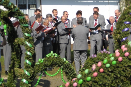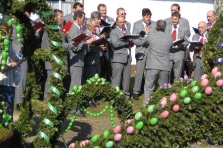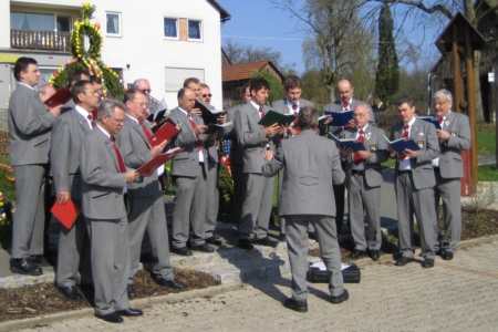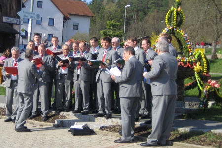 Gänsehaut mag den einen oder anderen schon befallen haben, als dann noch die wunderbaren Tenöre und Soli von Jörg Ebenhack und Bernhard Eckert kaum noch eine stimmungsvolle Steigerung zuließen. Der liebe Gott bedankte sich jedenfalls mit strahlendem Sonnenschein. Anschließend boten die Sänger das gleiche Repertoire an Liedern mit dem Lobpreis Gottes, der Natur, des Frühlings und der Heimat am monumentalen Osterbrunnen von Bieberbach. Ein zu Ostern kunstvoll gestalteter Ort, der allerdings sehr viel stärker vom Tourismus überlagert wird.
