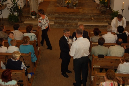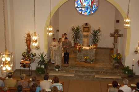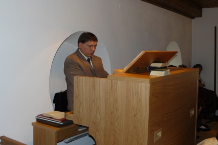 | Am 15. August 2007 (Mariä Himmelfahrt) wurde die von Willi Müller gestiftete Orgel im Rahmen eines von H. H. Pfarrer Werner Wolf zelebrierten Festgottesdienstes geweiht. Organist Richard Mager spielte zu diesem Anlass Trompet Voluntary von John Stanley, das Ave Maria von Franz Schubert und Hornpipi/Wassermusik von Händel. Umrahmt wurde der Gottesdienst von der Singgruppe des FSV Geschwand. Anschließend trafen sich die Geschwander und Lindner Bürger im Zelt unterhalb der Kirche bei Bier und Gegrilltem zum gemütlichen Beisammensein. Der Erlös der Orgelweihe und des Festes kam der Geschwander Kirche zu Gute. |