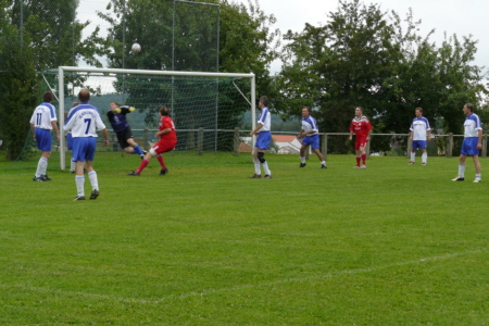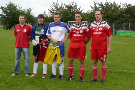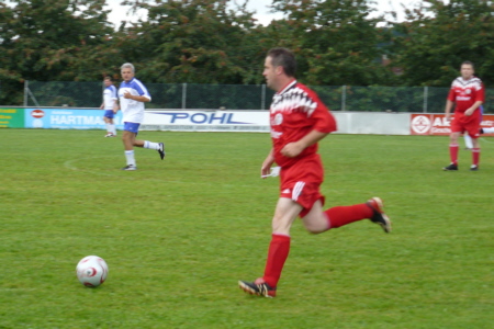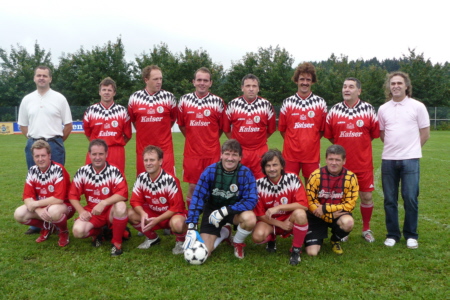 | Im Jahre 1987 sind die Fußballer des TSV Geschwand erstmals in die damalige B-Klasse aufgestiegen. Dieser Erfolg wurde nach jetzt 20 Jahren gebührend gefeiert: Mit einem Einlagespiel der damaligen Aufstiegself gegen die Ü 40 des SC Kühlenfels, die sich glücklich mit 6:5 durchsetzte. Dass es früher einmal schneller ging, merkte Reinhold Eckert, der einzige heute noch aktive Fußballer der Aufstiegself, schon nach fünf Minuten. "Na kummt halt", forderte er seine Mitspieler auf, als sie bei einer Kontermöglichkeit nicht schnell genug nachrückten. Auch heute noch ist Eckert mit 43 Jahren eine der Stützen der ersten Mannschaft des TSV Geschwand. "Mit seiner Erfahrung und seiner Übersicht als Libero ist er immer noch wertvoll für uns", sagte Bülent Yildirici am Spielfeldrand. Der Spieler der aktuellen ERSTEN war einer von über 100 Zuschauern, die trotz des schlechten Wetters den Auftritt der Altstars nicht versäumen wollten. Und sie alle kamen auf ihre Kosten. Feine Doppelpässe, gelungene Spielzüge und viele Tore wurden geboten, wobei sich vor allem zwei Akteure in der ersten Halbzeit besonders hervortaten: Natürlich Reini Eckert, der zunächst mit einem Fernschuss beide Pfosten gleichzeitig testete, ehe er mit einem satten 25-Meter-Schuss seinen Treffer markierte. Aber auch Reini Igl, in den 90ern sechs Jahre Trainer beim TSV Geschwand, spielte sich mit zwei Treffern in Halbzeit eins in den Vordergrund: Allerdings traf der gebürtige Kühlenfelser zunächst für die gegnerischen Farben. Ob ihn der TSV-Vorsitzende und Stadionsprecher Karl-Heinz Melch deswegen DOPPELHERZ nannte? "Jetzt wird’s Zeit, dass Du endlich unser Trikot anziehst" forderte er Igl nach dessen zweitem Treffer auf. Als Igl dies in der Halbzeit auch tat und auch für den TSV Geschwand einlochte, war auch Josef Eckert, sein Gegenspieler aus dem ersten Abschnitt, wieder versöhnt. Josef Eckert hatte sozusagen den weitesten Anfahrtsweg der 87er-Aufstiegself. Seit über 15 Jahren war ich nicht mehr in Geschwand, berichtete der Lehrer, der die letzten Jahre an einer deutschen Schule in Ägypten unterrichtet hat. Dort hatte ich kaum Gelegenheit zum Sport, sagte er, sichtlich außer Atem, nach den Spiel. Doch dafür, dass große Teile der Aufstiegsmannschaft nicht mehr aktiv gegen den Ball treten, schlugen sie sich recht wacker. Mit einer furiosen Aufholjagd verkürzten sie durch Treffer von Horst Zimmerer und Stephan Hauptmann, Geschwands Rekordspieler (883 Einsätze), noch auf 5:6. Überlegt schob Zimmerer, der für Geschwand in 82 Spielen 98 Tore erzielte, wie in alten Zeiten aus acht Metern den Ball ins Eck. Doch dass es zum Ausgleich nicht mehr reichte, war in Geschwand eher Nebensache, da nach dem Spiel das gemütliche Beisammensein im Vordergrund stand. Außerdem hätte man ja sogar mit 7:4 gewonnen, wenn man die zwei Tore von Igl der richtigen Seite zuschreibt. Aufgebot TSV Geschwand 1987/ 2007: Stephan Hauptmann, Martin Gmelch, Edmund Wiegärtner, Josef Eckert, Armin Dümler, Roland Bischoff, Alvin Dresel, Horst Zimmerer, Reinhold Eckert, Siegmund Zimmerer, Lorenz Wiegärtner, Siggi Neuner, Paul Hauptmann, Georg Mayer, Johannes Mayer, Reini Igl. |